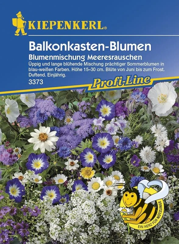 Die Blumenmischung „Balkonkasten-Blumen Meeresrauschen“ aus dem Kiepenkerl Profi-Line-Sortiment ist eine Mischung pflegeleichter Blumen für den Balkonkasten in kontrastreichem blau-weißem Farbspiel. Die ausgewählte Sortenzusammenstellung gewährleistet eine ununterbrochene Blüte von Juni bis zum Frost. Besonders reizvoll ist die Kombination vorgezogener Pflanzen aus dieser Mischung mit klassischen Balkonpflanzen. Mit einer Höhe von 15 bis 30 cm bleiben die Blumen vergleichsweise niedrig. Sie duften herrlich und spenden Insekten jede Menge Pollen und Nektar.