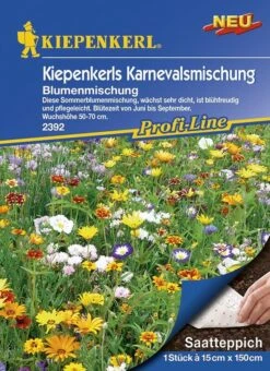 Die Blumenmischung „Kiepenkerls Karnevalsmischung“ aus dem Kiepenkerl Profi-Line-Sortiment ist eine überwiegend blau-gelb blühende, einjährige Bodendecker-Mischung, die schön dicht wächst und sehr pflegeleicht ist. Die Blumen erreichen eine Wuchshöhe von 50 bis 70 cm und sind im Zeitraum von Juni bis September enorm blühfreudig. Blaue Akzente werden unter anderem durch Kornblume, Leinkraut und Jungfer im Grünen gesetzt. Im Kontrast dazu blühen beispielsweise gelbe Sanvitalien, Ringelblumen und Zinnien.