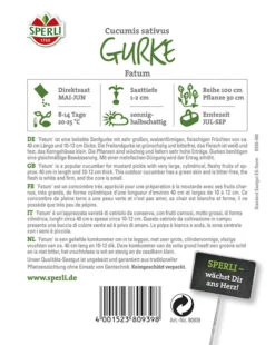 Die Salatgurke ‚Fatum‘ ist eine beliebte Riesenschälgurke mit sehr großen, walzenförmigen Früchten von ca. 40 cm Länge und 10 bis 12 cm Dicke. Ihre Schale ist grün, das Fleisch weiß und fest sowie bitterstofffrei und mit kleinem Kerngehäuse. Per Direktsaat werden im Mai oder Juni die Samen an einem sonnigen oder halbschattigen Platz im Beet ausgebracht. Die wüchsigen Pflanzen benötigen viel Wasser. Der Erntezeitraum fällt in die Monate Juli, August und September. Mit einer mehrfachen Düngung während der Anbauphase lassen sich die Erträge steigern.