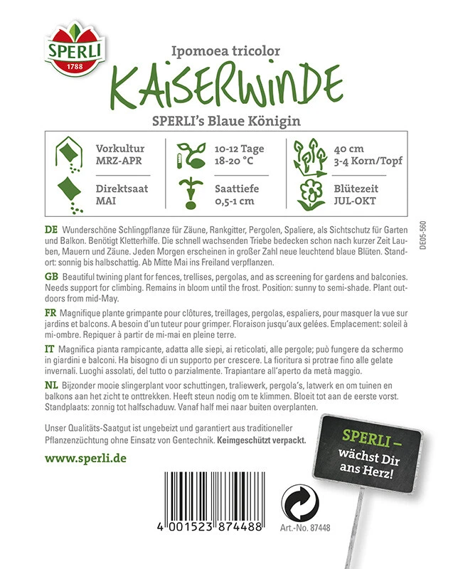 SPERLI’s Blaue Königin ist eine einjährige, schnellwüchsige Kletterpflanze mit kräftig leuchtend blauen Blüten. Ideal zur Begrünung von Zäunen, Drähten, Stangen oder Pergolen.