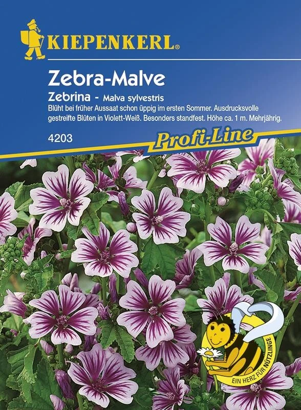 Besonders attraktiv wird die ‚Zebrina‘ dadurch, dass die Blüten bei zeitiger Frühjahrsaussaat nach wenigen Monaten im ersten Sommer in auffälligem rosa-violett-weiß gestreift erscheinen und dies in lange anhaltender Folge von Juni bis September. Also keine lange Anzucht mit Aussaat im Sommer und Überwinterung, Die Pflanzen wachsen buschig verzweigt und kompakt, werden nur ca. 60–100 cm hoch und sind deshalb standfester als normale Malven. Sie finden dadurch auch in kleinen Gärten, in Rabatten und in Gefäßen Platz.