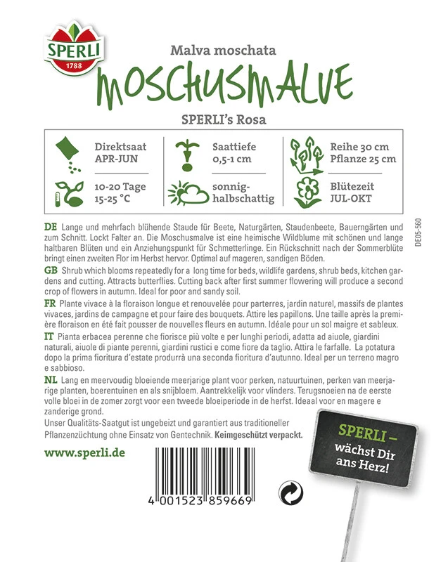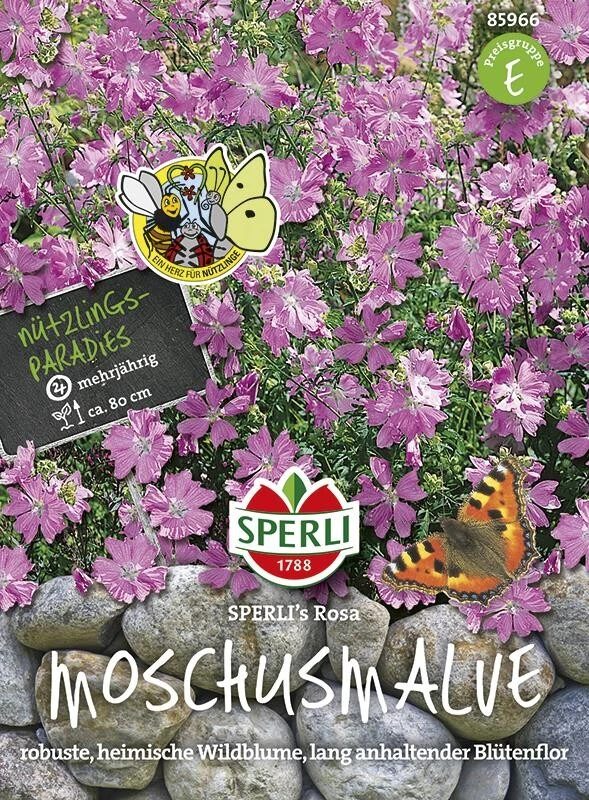 SPERLI’s Rosa ist eine mehrjährige, im nördlichen Europa heimische Wildblume mit festen Stielen und lange haltbaren, großen, zart rosafarbenen, leicht nach Moschus duftenden Blüten.