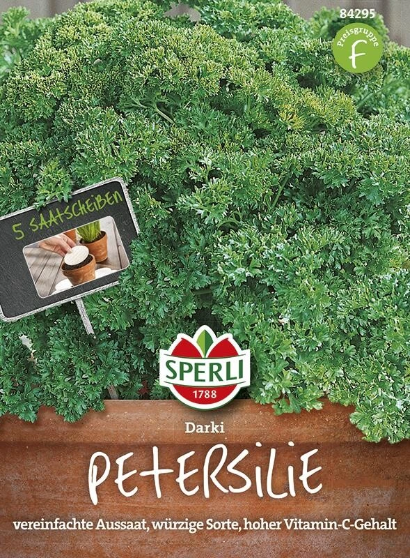 Dank der Saatscheibe ist die Aussaat der Petersilie ‚Darki‘ verblüffend einfach. Auf einem Trägermaterial sind die Samen bereits im richtigen Abstand angeordnet, sodass die Scheibe nur noch in einem Topf mit keimfreier Aussaaterde gelegt und angegossen werden muss. Im Haus ist die Kultur ganzjährig möglich, im Freien dagegen sollte die Aussaat zwischen März und August erfolgen. Die Aussaatscheibe muss regelmäßig gegossen werden, ohne sie zu vernässen. Später können die Pflanzen aus dem Topf ins Freiland umziehen. ‚Darki‘ ist sehr würzig und zeichnet sich durch einen besonders hohen Vitamin-C-Gehalt aus.
