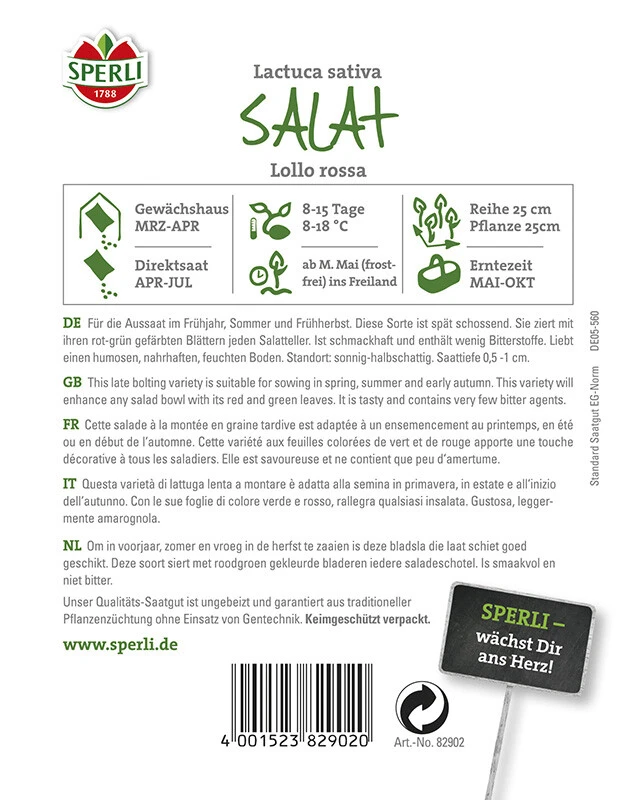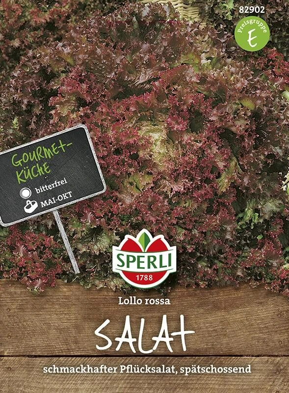 Der Salat ‚Lolla Rossa‘ ist ein roter Pflücksalat für die Aussaat im Frühjahr, Sommer und Frühherbst. Diese Sorte ist spät schießend und ziert mit ihren rot-grün gefärbten Blättern jeden Salatteller. Sie sind äußerst schmackhaft, da sie nur wenige Bitterstoffe enthalten. ‚Lolla Rossa‘ kann im Gewächshaus im März oder April und im Freiland von April bis Juni ausgesät werden. Die Pflanzen lieben einen humosen, nahrhaften, feuchten Boden sowie sonnige bis halbschattige Standorte. Die Ernteperiode erstreckt sich von Mai bis Oktober.