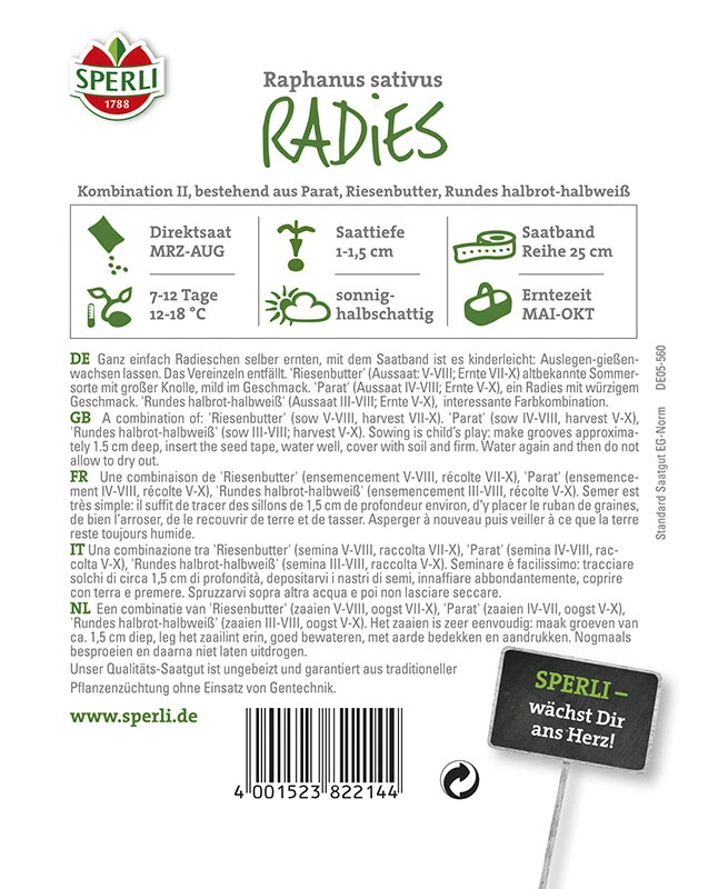 Die „Radies Kombination II“ setzt sich aus den drei Sorten ‚Riesenbutter‘, ‚Parat‘ und ‚Rundes halbrot-halbweiß‘ zusammen. ‚Riesenbutter‘ bildet runde, große Knollen, sehr kräftiges Laub und hat eine geringe Neigung zur Pelzigkeit. ‚Parat‘ ist ein Radies, das nicht pelzig wird. Die Knollen sind groß, besonders festfleischig und mit dünner karminroter Schale. ‚Rundes halbrot-halbweiß‘ ist eine zweifarbige, mittelstark wachsende, runde Sorte. Alle drei Sorten können dank des praktischen Saatbandes im Handumdrehen ausgesät werden. Die Erntezeit fällt in die Monate Mai bis Oktober.