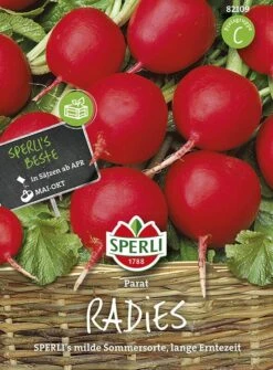 Bei dem Radies ‚Parat‘ von SPERLI handelt es sich um eine milde Sommersorte mit langer Erntezeit. Die Radieschen sind besonders groß und festfleischig und werden auch im Hochsommer nicht pelzig. Ihre Haut ist dünn und karminrot, ihr Geschmack mild und aromatisch. ‚Parat‘ ist geeignet für Folgeaussaaten alle 2 bis 3 Wochen. Ein lockerer, humoser Boden ist die beste Grundlage für eine erfolgreiche Anzucht. Um die Pflanzen vor der Rettichfliege zu schützen, können sie mit einem Gemüsenetz überspannt werden.