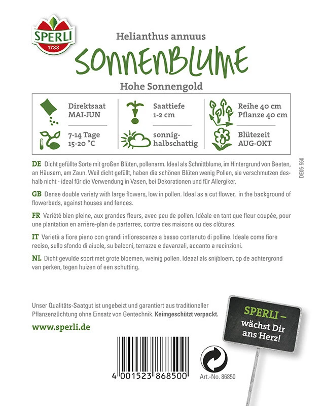Diese grossblumigen Sonnenblumen bilden einen Blickfang vom August – Oktober in jedem Garten. Durch die Höhe ist diese Sorte besonders als Hintergrundpflanze zu verwenden.