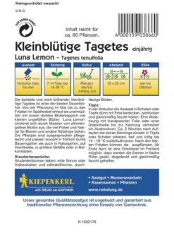 Sehr reich und ausdauernd blühende, kleinblütige Tagetes, deren zitronengelbe Blüten besonders intensiv leuchten. Die Pflanzen wachsen reich verzweigt und kugelig, bei flächiger Pflanzung als dichter Teppich.