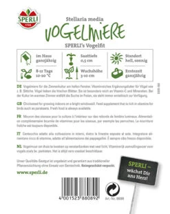 SPERLI’s Vogelfit ist eine begehrtes Grünfutter für alle Ziervögel und Heimtiervogelarten. Nur in Kästen oder Töpfen aussehen, da sich die Pflanzen leicht versamen und dann schwer aus Beetn zu entfernen sind.