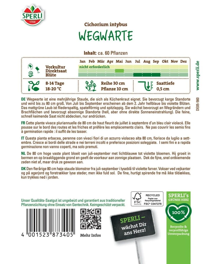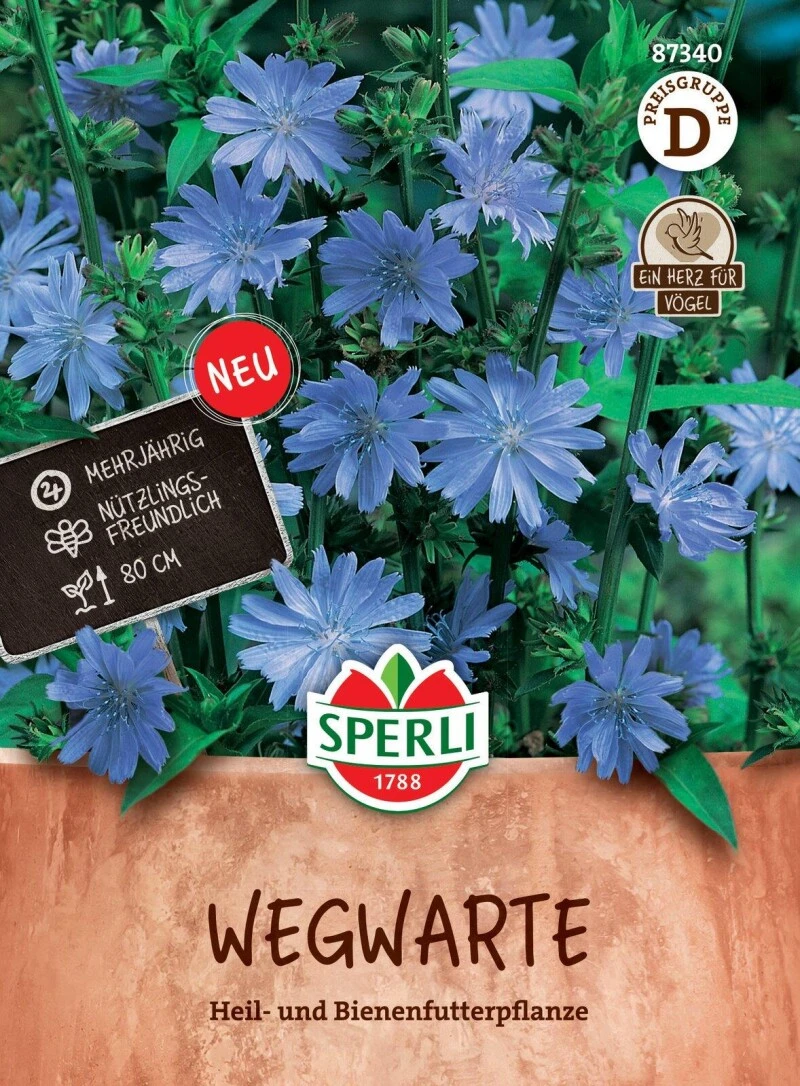 Die Wegwarte ist eine Heil- und Bienenfutterpflanze. Die mehrjährige Staude kann bis zu 80 cm groß werden. Ihre Blüten strahlen in einer hellblauen bis violetten Farbe. Das mattgrüne Laub ist fliederspaltig, spatelförmig und spitzlappig. Die Wegwarte eignet sich gut als Küchenkraut. Außerdem gehört sie zu den Stauden, die besonders beliebt bei Nützlingen ist. Die Staude wird im Mai direkt ausgesät. Eine Vorkultur ist nicht notwendig. Ihre hellblau bis violett leuchtenden Blüten trägt sie von Juli bis Ende September.