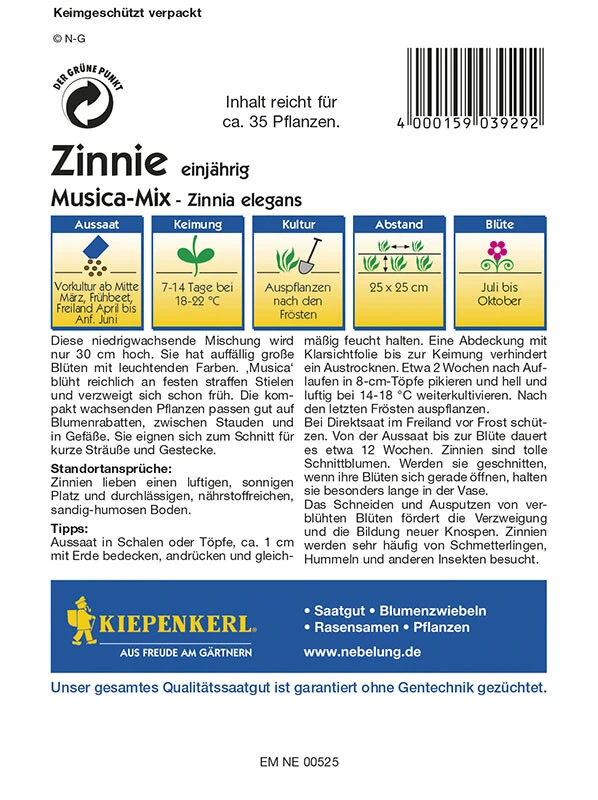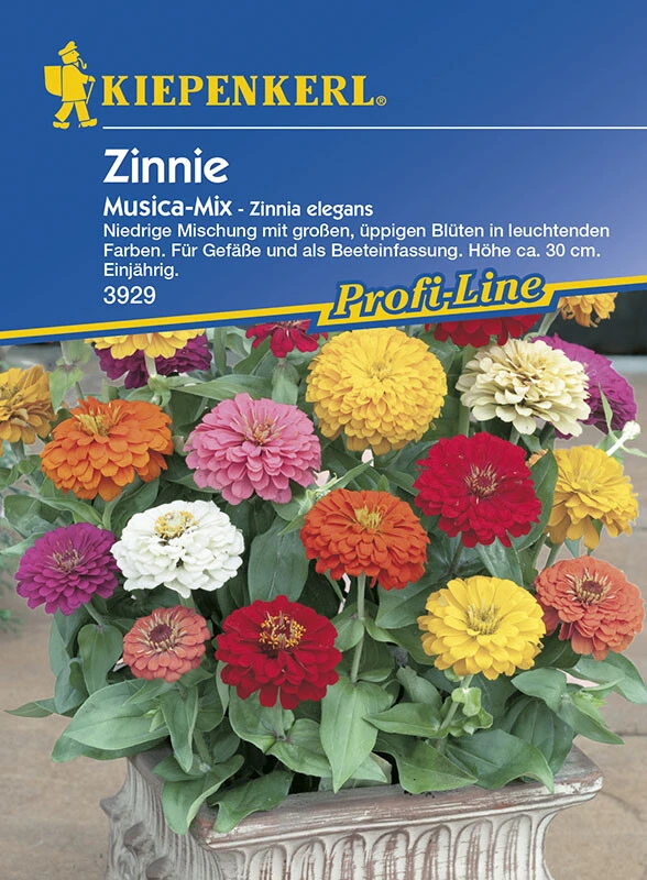 Große, üppige Zinnienblüten in leuchtenden Farben liefert diese niedrig bleibende Farbenmischung über den ganzen Sommer. Ideal für Beete, Einfassungen und Gefäße.